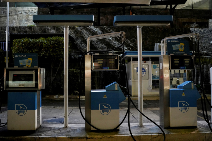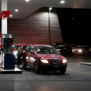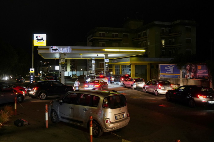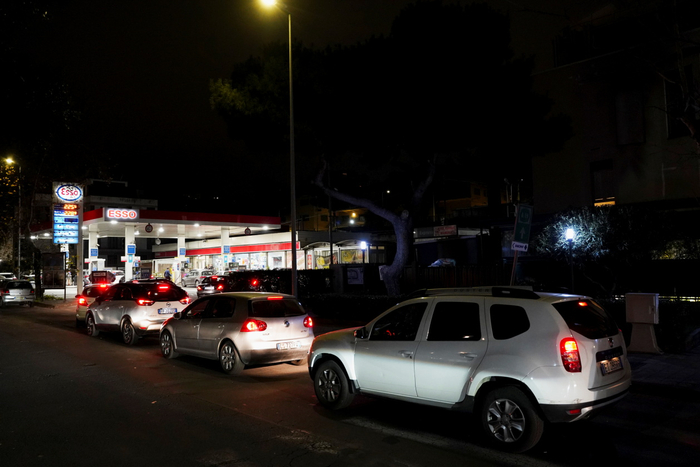 当地时间2022年3月11日,意大利卡塔尼亚,汽油价格上涨,司机开车在加油站外排长队加油。