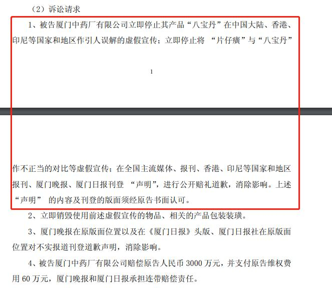 2015年8月17日,厦门中药厂反将一军,向福州中院提交了诉片仔癀等公司不正当竞争的起诉状,请求判令片仔癀立即停止侵犯厦门中药厂“八宝丹”系列产品品牌的虚假宣传行为,赔偿厦门中药厂经济损失和合理维权费用299.7万元。