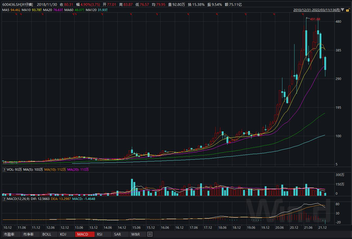 与价格一同退烧的,还有公司的股价,Wind数据显示,片仔癀的股价自去年7月30日触及491.88元的高点后便一路下跌,最低时一度跌破300元,截至3月11日,片仔癀股价收报318.52元,相比高点跌幅达35.24%,市值累计蒸发超760亿元。