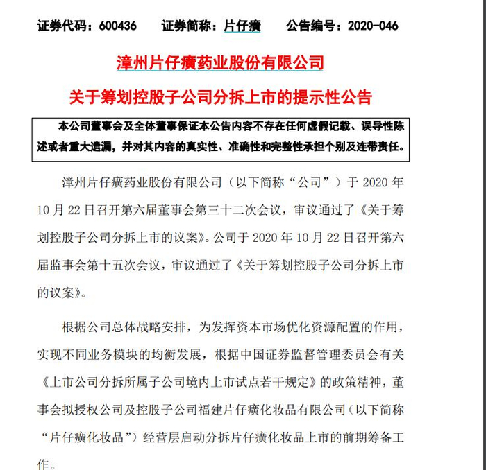 值得一提的是,片仔癀化妆品板块还计划冲刺IPO。2020年10月,片仔癀公告表示,根据公司总体战略安排,为发挥资本市场优化资源配置的作用,实现不同业务模块的均衡发展,拟启动分拆片仔癀化妆品上市的前期筹备工作。