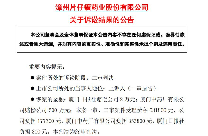双方一直上诉至福建省高级人民法院,最终在2019年12月25日,片仔癀发布公告表示胜诉。