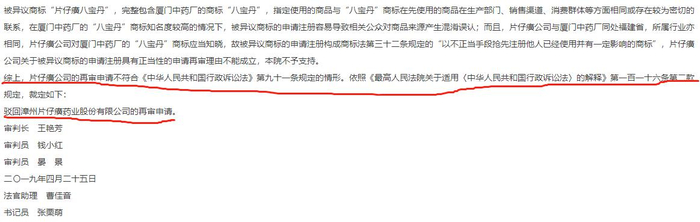 随后,片仔癀公司又向商评委提出复审,被驳回后。片仔癀将商评委直接告上了法院,相关诉讼一直持续至2019年,最后最高人民法院宣布驳回片仔癀药业的再审申请,维持原判。