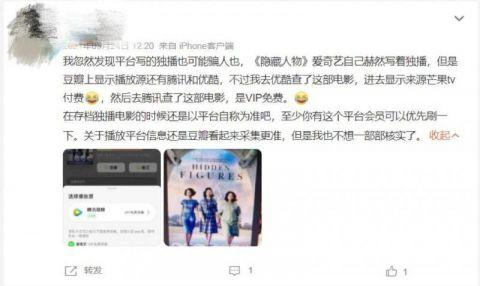 同样的情况不限于付费电影。比如说视频平台中标注的“独播”,其实版权并不独属于一家平台;有些动辄几十集的电视剧,看着看着,版权突然从一家“跳”到了另一家,于是看到一半还得转场购买其他平台会员,李小姐就曾经历过这样的事情。“我在看电视剧《鸡毛飞上天》。前几个月还在爱奇艺,这两天显示是腾讯视频独家了。”看到一半的李小姐,只得停下在爱奇艺追剧的步伐。