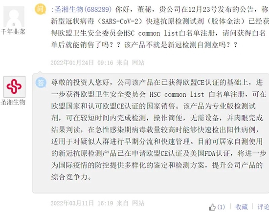 3月11日,圣湘生物在互动平台表示,目前,可居家自测使用的新冠抗原检测产品已在申请欧盟CE认证及美国FDA认证,将进一步为国际疫情的防控提供多样化的鉴定和检测方案,提升公司产品的综合竞争力。