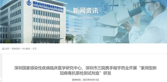 3月13日,国家感染性疾病临床医学研究中心官网消息,3月11日,深圳国家感染性疾病临床医学研究中心、深圳市第三人民医院与翰宇药业签订约束性意向书,独家授权翰宇药业开展“家用型新型冠状病毒抗原检测试剂”商业化开发、注册及销售。