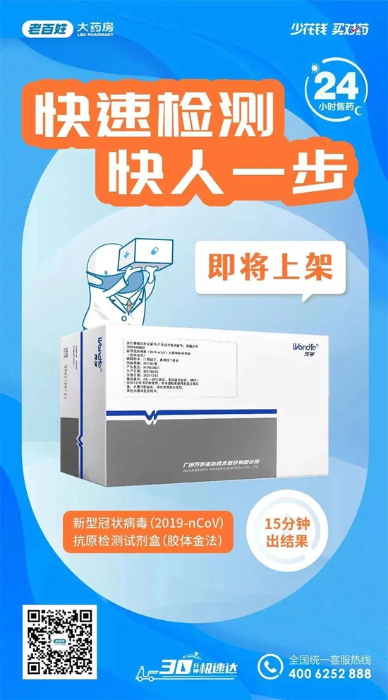 据了解,老百姓大药房分销广州万孚生物的第一批新冠抗原快测产品预计将于14日上午起在线下门店和线上同步上架销售。