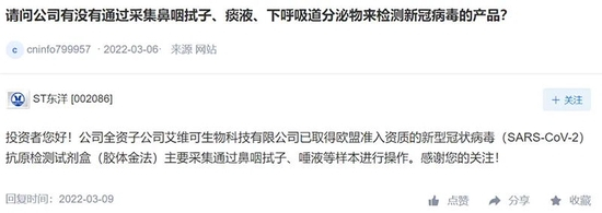 3月9日,ST东洋在互动平台称,公司全资子公司艾维可生物科技有限公司已取得欧盟准入资质的新型冠状病毒(SARS-CoV-2)抗原检测试剂盒(胶体金法),主要采集通过鼻咽拭子、唾液等样本进行操作。