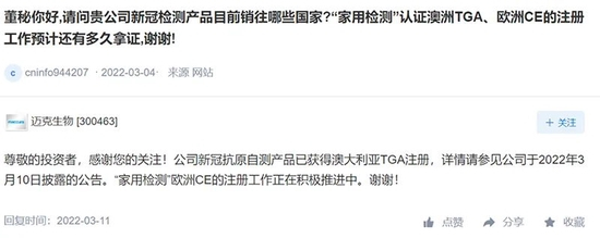 3月11日,迈克生物在互动平台称,公司新冠抗原自测产品已获得澳大利亚TGA注册,“家用检测”欧洲CE的注册工作正在积极推进中。