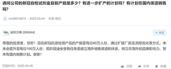 3月9日,迪安诊断在互动平台称,公司有15分钟新冠快速检测盒,目前新冠抗原检测产品的产能是每日60万人份。通过扩建厂房及流程优化等方式,未来会提升至每日100万人份。现阶段迪安生物的任务是建立海外销售渠道和体系,主要在德国、奥地利等欧洲国家销售,暂未有国内销售计划。