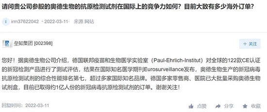 3月11日,垒知集团在互动平台称,公司参股公司奥德生物介绍,德国联邦疫苗和生物医学实验室(Paul-Ehrlich-Institut)对全球的122款CE认证的新冠检测产品进行了测试评估,结果在国际知名医学期刊Eurosurveillance发布,奥德生物生产的新冠病毒抗原检测试剂的综合性能排名第七,超过多家国际知名品牌。德国多家零售商、医院已大批量采购奥德生物试剂盒,目前已取得约1亿人份的新冠病毒抗原检测试剂的订单。