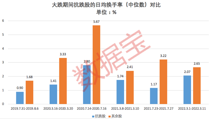 数据宝统计,82只抗跌股在上述6个时间段的日均换手率(中位数)均低于其余股票,多数时候不及其余股日均换手率的一半。比如2021年7月23日至27日,抗跌股日均换手率中位数1.17%,其余股高达3.22%。2022年3月,抗跌股日均换手率中位数2%左右,其余股接近3%。