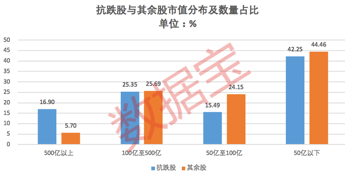 从市值来看,以最新收盘日数据统计,抗跌股平均市值超千亿,其余股均值低于200亿元。50亿以下、100亿至500亿这两者个股占比基本相当,其中50亿以下股占比40%左右,100亿至500亿股占比25%左右。但500亿以上市值股数量分布差距较大,其中抗跌股占比16.9%,其余股不到6%。