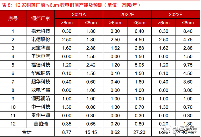 未来两年 4.5μm 极薄铜箔的产量或将主要来自于 12 家铜箔厂商。由于锂电铜箔正处于逐步向 4.5μm 转换的过程之中,因此我们需进一步分析和预测 4.5μm 锂电铜箔的供需格局变化。结合前 文,目前嘉元科技、诺德股份等 12 家铜箔厂商掌握了 4.5μm 极薄铜箔的生产技术,其中领先企 业已经具备批量供货的能力。这些铜箔厂商未来的新增产聚焦在≤6μm 极薄锂电铜箔,新建项目 基本都规划了 4.5μm 极薄铜箔产能,新建的生产线具备 6μm 向 4.5μm 铜箔转产的能力。预计 2022-2023 年这 12 家铜箔厂商≤6μm 极薄锂电铜箔的产能合计将达到 27.23 万吨/年、42.18 万吨/ 年,较前一年分别增加 11.78万吨/年和 14.95 万吨/年,分别占当年全球锂电铜箔产能增量的 73% 和 76%。我们将从这 12 家铜箔厂商的新增产能入手,预测未来两年 4.5μm 锂电铜箔的产量。