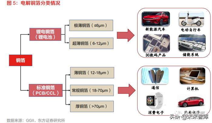 锂电池负极目前多采用 8μm 以下厚度的锂电铜箔。根据应用领域的不同,电解铜箔可以分为应用 于印制电路板的电子电路铜箔,以及应用于锂电池的锂电铜箔;根据铜箔厚度不同,按照通行标准可以分为极薄铜箔(≤6μm)、超薄铜箔(6-12μm)、薄铜箔(12-18μm)、常规铜箔(18- 70μm)和厚铜箔(>70μm)。锂电铜箔目前多采用 8μm 以下的铜箔产品,而电子电路铜箔一般 较锂电铜箔更厚,大多在 12-70μm。
