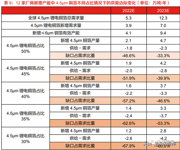 4.5 微米锂电铜箔的供需格局明显优于锂电铜箔整体市场。同样在产能利用率 70% 假设下,当 12 家厂商新增产能中 4.5μm 铜箔占比为 50%时,预计 2022-2023 年全球新增 4.5 微 米锂电铜箔市场供需缺口分别为-46.6%、-33.3%。表明 2021-2023 年,随着全球 4.5 微米锂电铜 箔渗透率的提升,供需缺口大幅扩大,4.5微米锂电铜箔的供需格局明显优于锂电铜箔整体市场。(报告来源:未来智库)
