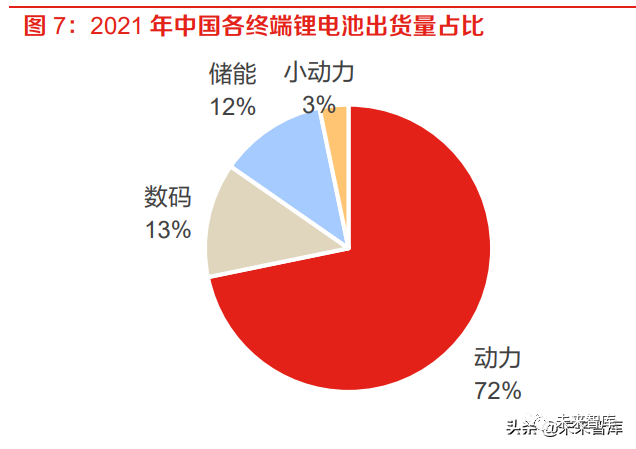 2021年我国锂电池出货量同比增长 114%,第一大应用领域动力电池的占比扩大至 72%。2021 年至今,国内新能源汽车市场出现爆发式增长的趋势,数码产品市场的增长稳定,锂电池储能应用广泛。根据高工锂电(GGII)统计数据,2021 年中国动力电池出货量为 220GWh,同比增幅 达 175%,终端占比由 2020 年的 56%扩大至 72%;储能电池和小动力电池的出货量分别为 37.0GWh 和 10.0GWh,分别占比 12%和 3%。近年来我国 3C 数码电池出货量增速相对稳定,预计 2021 年我国 3C 数码电池出货量约为 39.5GWh,占比为 13%。综上,受益于国内新能源汽车 动力电池的爆发式增长,2021 年中国锂电池出货量合计达 306.5GWh,同比增长 114%。