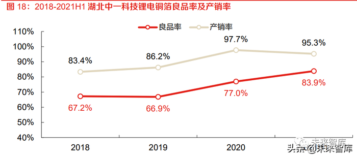 新建高端铜箔产线良品率低,或将拖累有效产能释放。以湖北中一科技招股书中披露的募投项目 的产能建设和达产时间表为例,产能建设时间长达 21 个月,而从投产到产能爬升至 100%还需要 15 个月。湖北中一科技曾于 2018 年和 2019 年分别建成投产极薄锂电铜箔产线,新产线试生产期 间所生产的锂电铜箔产品良品率较低,导致产品生产成本较高。同时,新产线试生产期间的产品 质量也受到影响,湖北中一科技 2018-2019 年锂电铜箔产品的产销率也有一定幅度的下降。因此, 高端铜箔产能能否快速有效释放仍具有较大的不确定性。