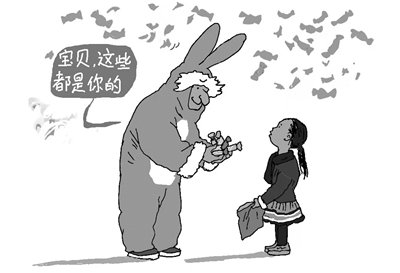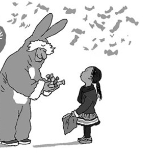 对糖果最在意的是孩子们,早准备了各种袋子。笔者女儿当时6岁多,正是爱吃巧克力的年龄。在拥挤的人群里,女儿每抢到一个巧克力,她都十分开心。随着游行的继续,在我们的帮忙下,女儿的袋子渐渐鼓起来,她也喜笑颜开了。忽然,游行方队的一个“兔子阿姨”停下来,从篮子里大把大把地掏巧克力和糖果放到女儿袋子里。女儿正不知所措,她友善地用英语说:“给你的,宝贝!”