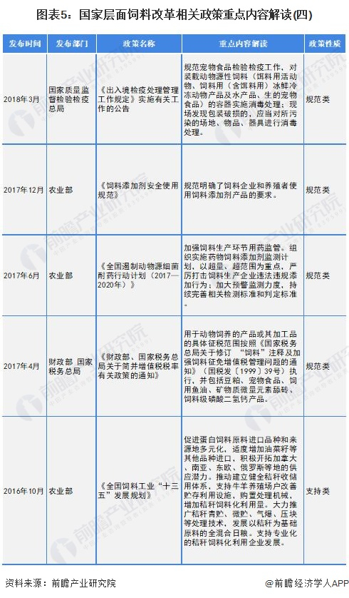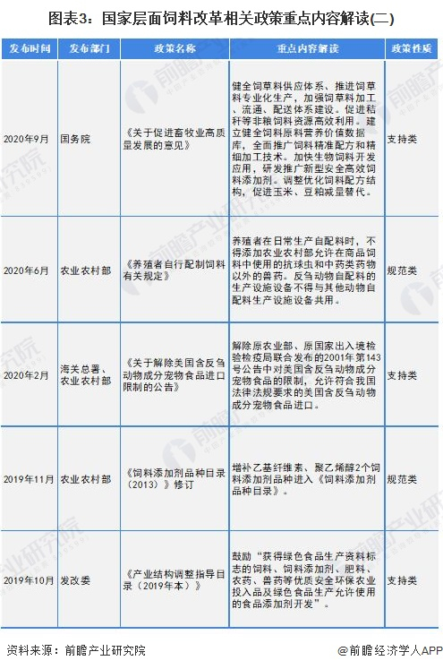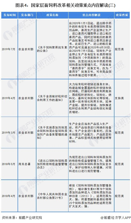 近年来,国务院、发改委、农业部等多部门都陆续印发了支持、规范饲料行业的发展政策,内容涉及推广饲料精准配制技术、促进玉米、豆粕减量替代、停止生产含有促生长类药物饲料添加剂(中药类除外)等内容。