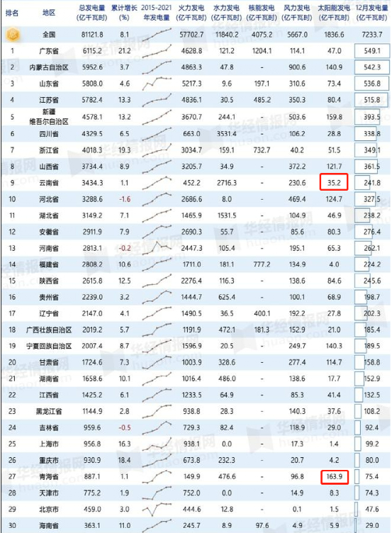 根据华经产业研究院统计,云南省2021年的太阳能发电量为35.2亿千万时,只有“太阳能第一省”青海的21.5%。