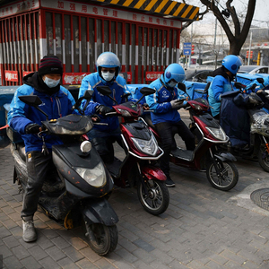 3月11日下午,在广州珠江新城的某一街头转角处,6名外卖从业者坐在自己的“坐骑”上,围在一起聊天、说笑,等待接单。