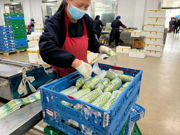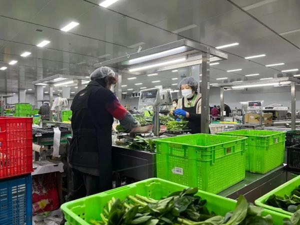 记者在包装车间看到,按规定佩戴口罩和帽子的工人们正对各类蔬菜进行包装,这些蔬菜包装完毕后将被发往上海各处,以保障疫情期间市民的“菜篮子”不断货。