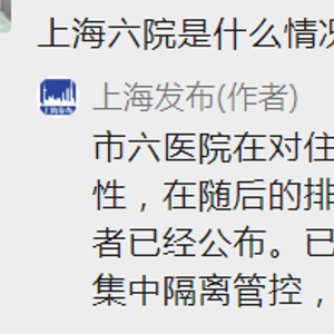 11日,有网友提问“上海六院是什么情况啊??”,上海发布回应称:市六医院在对住院病人进行风险排查时发现一外省来沪住院病人核酸检测阳性,在随后的排查中又陆续发现阳性感染者。经疾控部门复核确认的阳性感染者已经公布。已对医院采取全院封闭管控,排查出的密接和密接的密接者均已集中隔离管控,医院对仍在院的住院病人继续做好医疗服务。