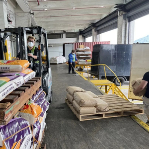 仓库操作人员加班加点进行大米进出仓操作