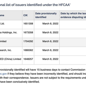 3月11日,证监会针对SEC依据《外国公司问责法》认定五家在美上市公司为有退市风险的“相关发行人”回应表示,这是美国监管部门执行《外国公司问责法》及相关实施细则的一个正常步骤,并表明中方“始终坚持开放合作精神”,但也“坚决反对一些势力将证券监管政治化的错误做法 ”这一基本立场。
