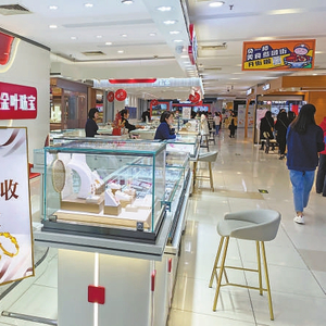 3月8日,记者在天虹百货福州万象城店一楼看到,由于黄金首饰促销活动火热,不少品牌黄金珠宝柜台(以下简称金柜)前都围着挑选首饰的消费者。六福珠宝、周大福和周大生的广告旗旙上分别写着“计价黄金每克减38元”“计价黄金饰品单件克重大于10克的,首克优惠40元,第2克起每整克优惠20元”和“黄金类每克减60元 工费8折”,还有其他品牌“黄金每克减40元”“计价金每克减45元”等广告宣传,不一而足。