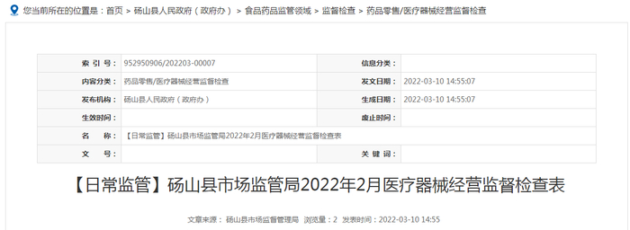 安徽省砀山县市场监管局发布2022年2月医疗器械经营监督检查表