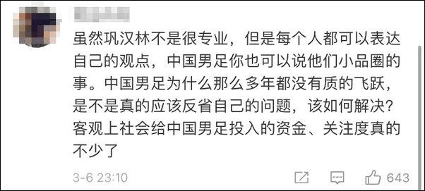 最后一个例子,巩汉林虽然没有“指名道姓”,但网友们心知肚明他说的是中国男足。加上此前世亚预比赛中表现不佳,1:3负于越南告别2022卡塔尔世界杯,中国男足再一次被顶上风口浪尖。