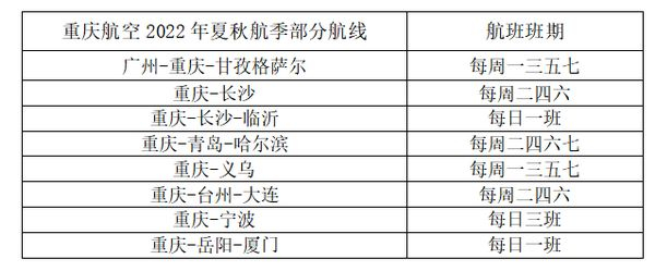 重庆航空2022年夏秋航季部分航线航班班期