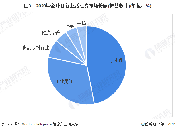 世界发达国家从20世纪70年代开始,环保行业逐渐成为活性炭的主要消费市场。从活性炭的传统市场来看,其在制糖、发酵、制药、食品、轻工、医药、冶金、化工、兵工等领域中广泛应用。近年来,随着社会的发展,活性炭在向与人类生存环境息息相关的环保、净水、空气分离、电子信息、原子能及生物工程、纳米材料、高能电极材料、高效催化剂载体等高新科技领域渗透扩展中,找到了更为广阔的新用途。根据Mordor Intelligence数据,按营收市场份额占比计,2020年,水处理领域的活性炭需求量最大,约占总市场份额的46.94%,其次分别为工业用途、食品饮料行业、健康疗养、汽车以及其他行业需求,占比分别为:31.38%、7.50%、5.28%、4.72%以及4.18%。