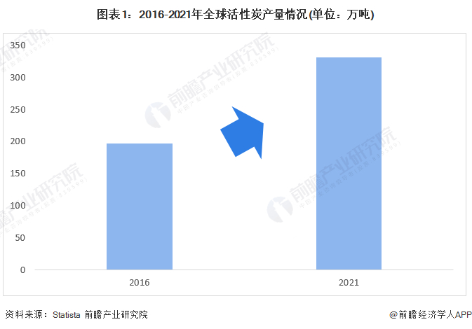 近年来,随着全球活性炭技术的不断发展,活性炭行业产能迅速增加。Statista数据显示,全球活性炭总产量已从2016年的196.2万吨,增长到2021年的331.1万吨。