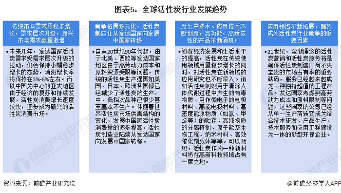 未来全球活性炭行业的发展趋势主要体现为以下四个方面:传统市场需求量稳步增长,需求层次升级,新兴市场需求数量激增;竞争格局多元化,活性炭制造业从发达国家向发展中国家转移;新生产技术、应用技术不断创新,高功能,高适应性的产品不断涌现;应用领域不断拓展,服务成为活性炭行业竞争的重要因素。