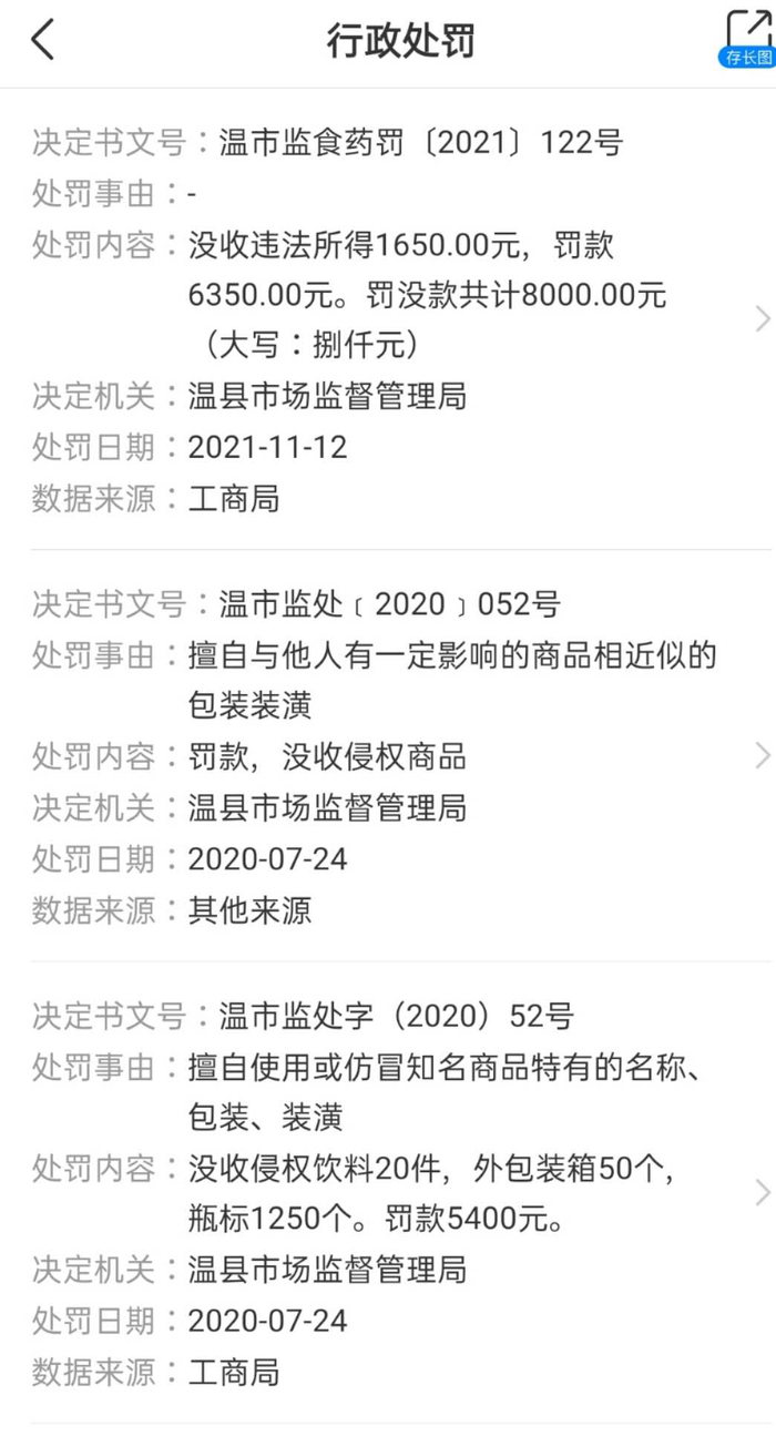 此外,山东省市场监管局在全省组织开展2021民生领域案件查办“铁拳”行动,也查处了3起“山寨”食品违法案件,相关企业分别被处以7.01万元到15.72万元不等的行政处罚。