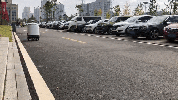 我们尝试通过“变形”来解决室内外两种运行环境的问题:在室外是一种低重心,宽轮距的形态,进入室内后变形成轮距窄,高度高的形态。这跟外卖员在室外骑车,到了室内就走路这两种行动模式有点像。