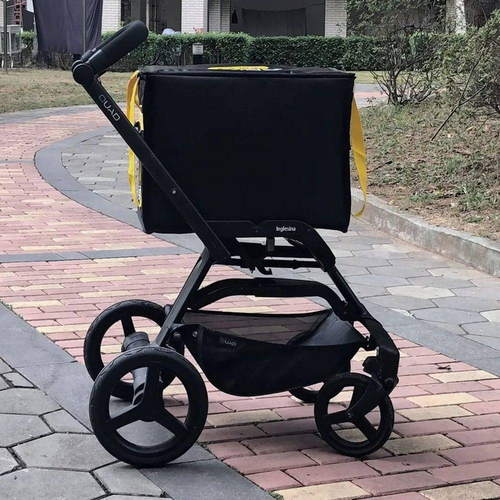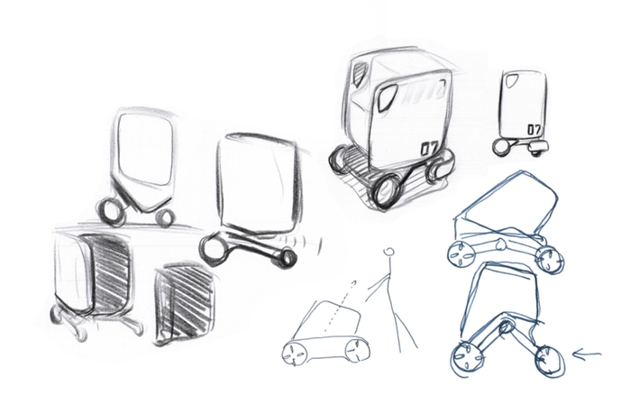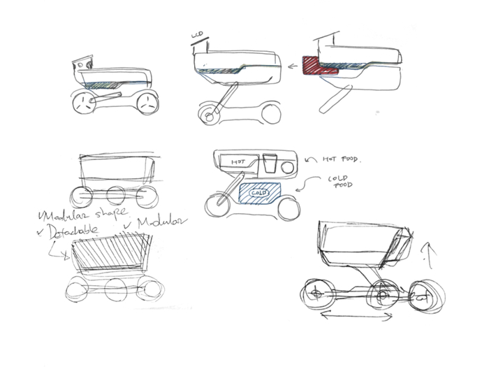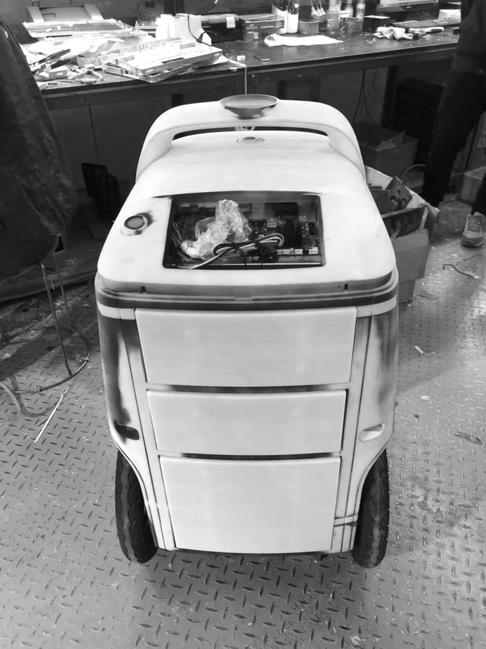 在构思初期,我们发现婴儿车的大小和功能和配送机器人有不少类似的地方:他们都需要在室内外通行,对平稳度要求比较高,取放婴儿的人机交互和取放外卖也有相似之处。因此我们将外卖箱,婴儿车和iPad简单结合做成一个快速原型机,在室内外场景做了一些验证测试,得到了非常直观的体验和初步数据:比如机器人的高度对运行稳定性和取餐方便性的影响,轮子的大小是否足够应对各种路面,轴距宽度和转弯半径大致需要多大。