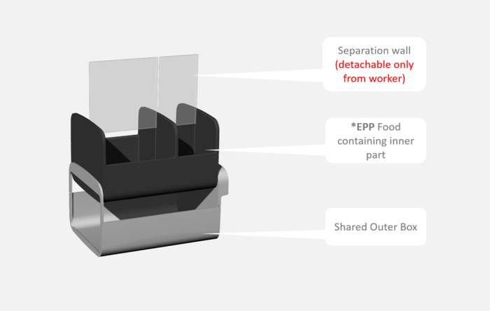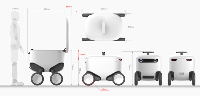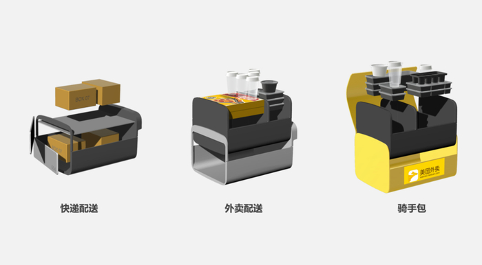 为了适应人机配合的过渡阶段,让Lunch Box机器人能和现有的人工外卖配送系统无缝配合,我们也研究了现有美团、饿了么的外卖箱的尺寸,让外卖员能够更方便快捷地和Lunch Box机器人合作完成订单,比如可以将整个内胆及其内货物一起从机器人内转移到骑手包内。