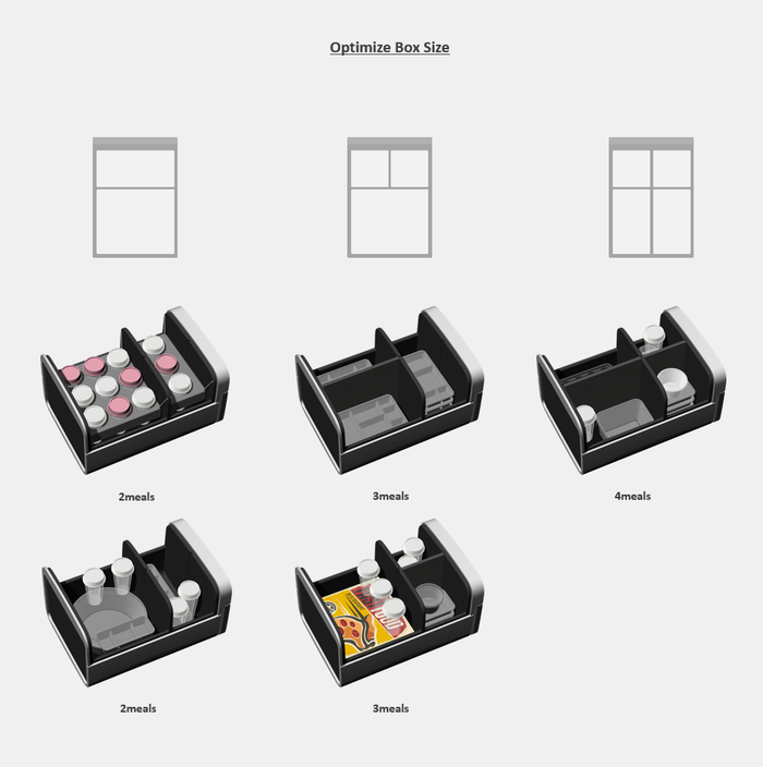 根据测量结果,我们对整个储存箱做了模块化设计,分为外壳,内胆和隔板,可灵活搭配隔板来应对不同的订单数量/类型。整个内胆也可以取出进行清洗或更换。