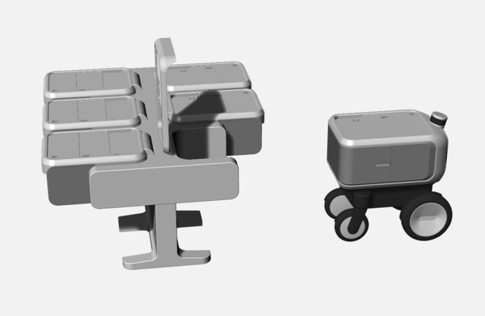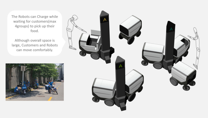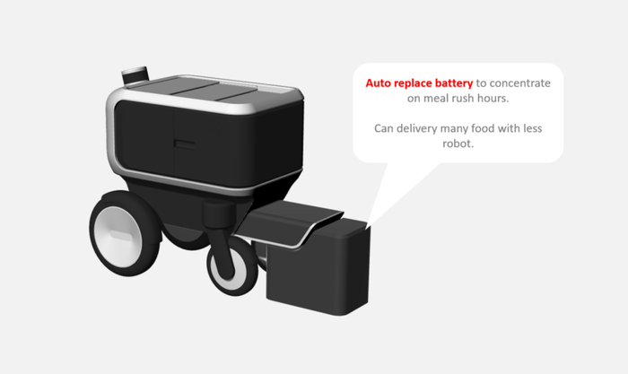此外我们还设想了临时基站的可能,方便机器人在等待顾客时进行短暂充电,甚至可以进行自动更换电池,减少机器人的空置时间,避免在配送高峰期出现机器人短缺的情况,提高整个系统的工作效率。