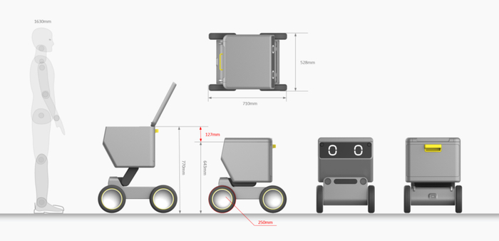 小车整体高度相对较高,仅通过后轮收缩减少转弯半径,同时稍微抬高货物仓,带来一定倾斜角度,方便取餐。