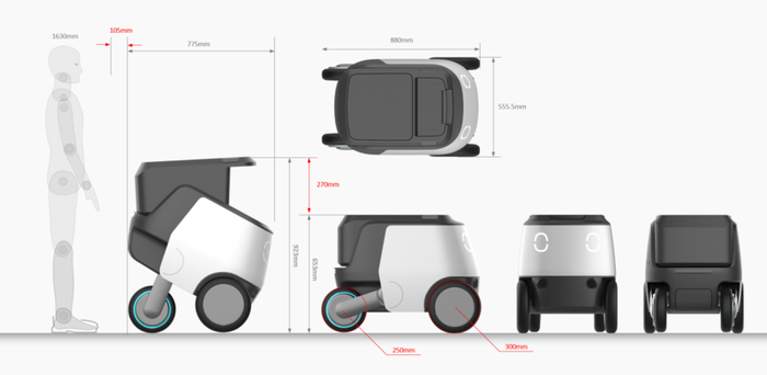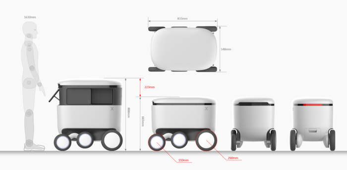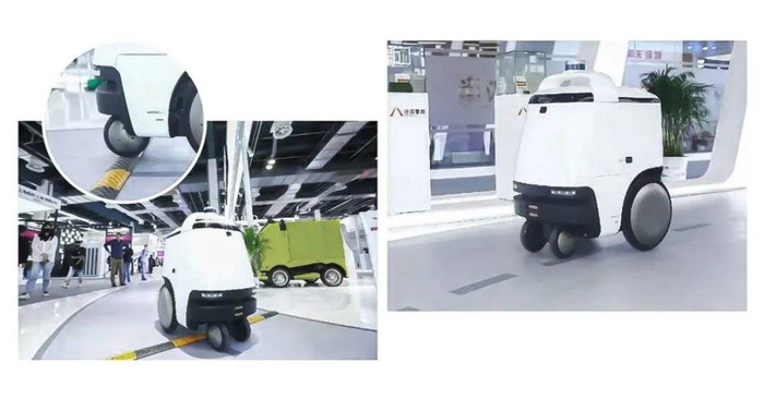 室外的无人配送车,为了能高速稳定地在室外复杂路况行驶,一般重心低,轴距比较长,轮子直径也比较大。这也导致了车的占地面积大,转弯半径大,不灵活,对于进入室内行驶是个很大的障碍。而室内的无人配送机器人,为了方便在拥挤的室内、电梯灵活通行,一般做的占地面积很小,高度高,方便用户拿取货品。而这种高重心,小轮距的架构又让这种机器人在室外路况寸步难行。