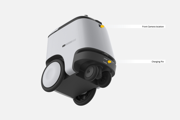 同样为较保守的方案,重心低适合在室外高速行驶,同时整体体积较小,虽然牺牲了运输容量,但这有利于在室内狭窄的环境里灵活运动,前方为转向轮,通过伸缩杆可抬高鱼眼相机传感器,避免被遮挡。