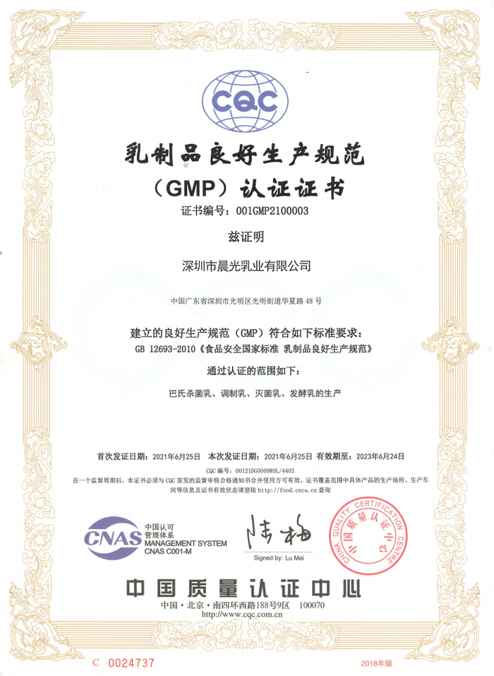 2021年7月,深圳市晨光乳业有限公司顺利取得GB12693-2010乳制品良好生产规范(以下简称“GMP”)体系证书。GMP管理体系证书的取得,证明了深圳市晨光乳业有限公司生产质量体系的软、硬件水平达到了国家规定的标准,晨光公司乳制品生产加工向着规范化、标准化方向迈进。