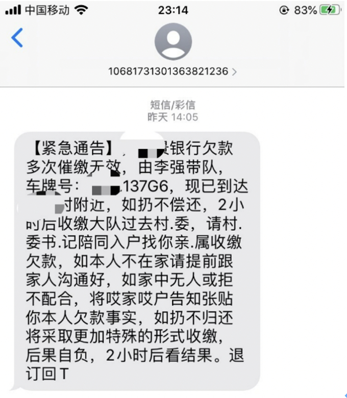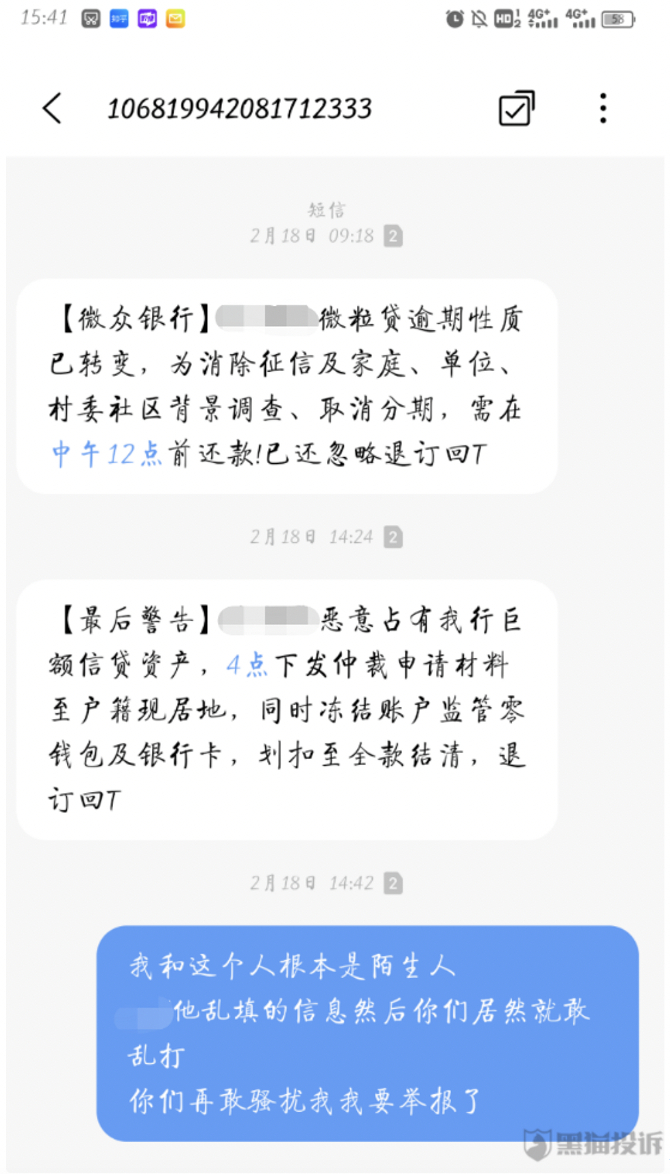 此外,投诉内容显示,该行还涉及向无关人员催债的情况。用户表示,从年后一直到三月份,微众银行持续对其发送陌生人的催债信息,电话短信轰炸,即使其多次解释不认识欠债人,甚至已向公安局备案,该行依旧没有停止侵权。