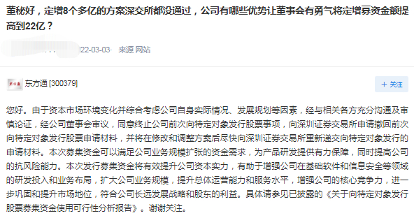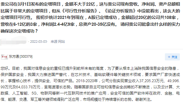 对此,投资者不无疑虑。有投资者在互动平台提问:“贵公司能拿出什么样的实力确保这次定增成功?”该投资者指出,公司在3月1日发布的定增金额不大于22亿,这与东方通现有营收、净利润、资产总额相比属于非常大的定增项目,但从《可行性分析报告》、《论证分析报告》中没能看出,这么大的定增项目可行性。