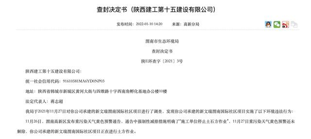 另一起违法案例中,2021年11月26日,渭南市高新区发布重污染天气黄色预警通告,通告中强制性减排措施明确了“施工单位停止土石方作业”,11月27日重污染天气黄色预警还未解除,但是渭南市生态环境局执法人员检查发现,陕西建工第十五建设有限公司承建的一个工程项目无视地方政府通告,当天仍在进行土方作业。因为该行为违反《中华人民共和国大气污染防治法》相关条款的规定,执法人员将进行土方作业的工程车辆予以查封。