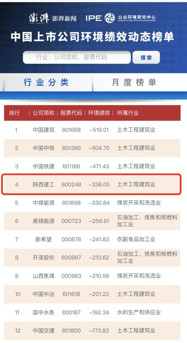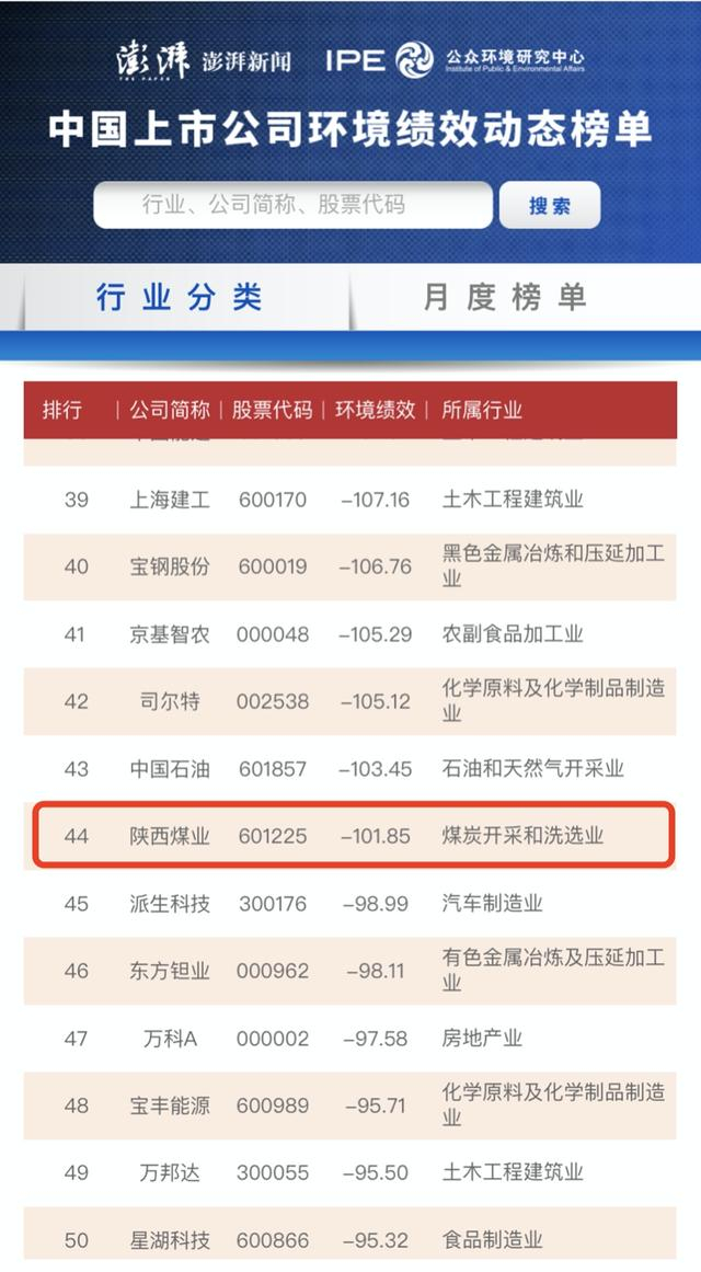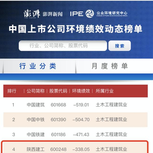 中国上市公司环境绩效动态榜单全国倒数第4名、全国倒数第44名,这是截至澎湃新闻发稿时,陕西建工集团股份有限公司(下称“陕西建工”)和陕西煤业股份有限公司(下称“陕西煤业”)的实时动态排名。